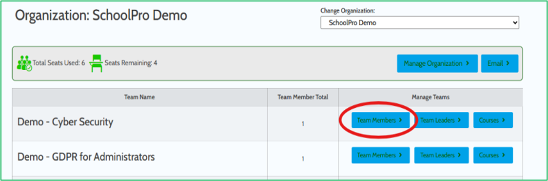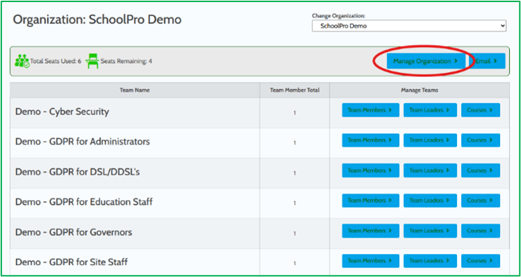 ‘Manage Organisation’ allows you to allocate a specific course to a team and then specific staff to that team and course.