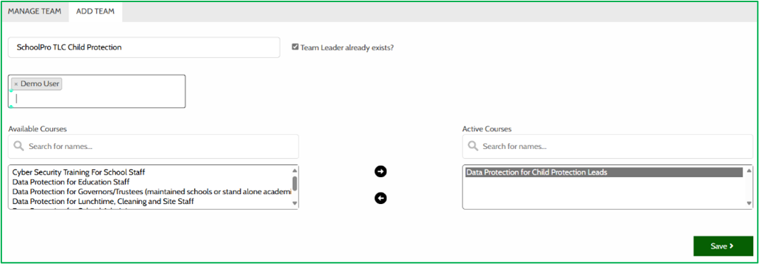 Click on ‘Add Team’ and you can create a new team, name it, allocate a staff member as leader and allocate a course.