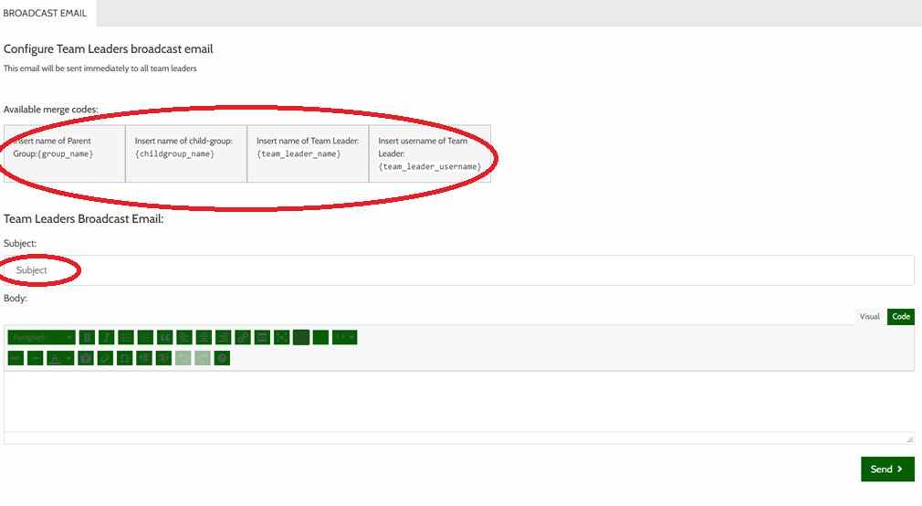 A pop-up window will open which allows you to configure a Team Broadcast Email which can be personalised using merge codes (see below).