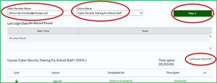 Certificates can be printed by visiting the ‘Team Members’ are, found below the list of user’s names. Select the user’s name and, if required, course from the two drop down menus, then click the ‘Filter’ button and you will see course progress and times detailed below.
