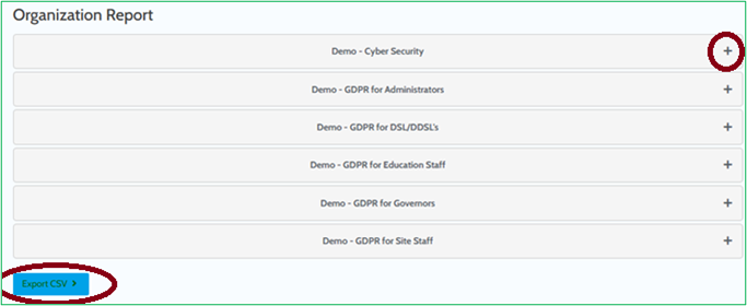Navigate to the Training Admin view, following the steps in Accessing Administrator Features, earlier in this guide. At the bottom of the page under ‘Organization Report’ is the reporting tool which allows you to view team and individual progress, as well as export the data as a CSV file (Excel Spreadsheet). The CSV report is what we recommend that you download and retain for your records before removing users or resetting course progress when training refresh is due (see sections below for how-to on both of those). If staff members have completed the course, their completion date will show on the spreadsheet.
