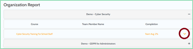 All staff and governors need to be in the Cyber Security training group and the Data Protection training group that relates to their job role (NB: the only exception to this is if your school gets this training from another provider). Once on the Training Administration page (see above), you will see your schools’ organisation.